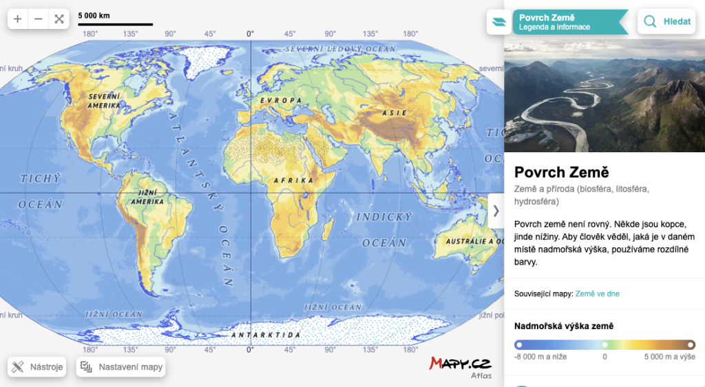 Základní geografickou pomůckou je zajisté atlas. Samozřejmě je vhodné, aby se žáci naučili pracovat s klasickým papírovým, ale ten elektronický má své výhody. Online atlas od Seznamu je vynikajícím pomocníkem pro studenty i učitele. Lze si zde vybrat různé druhy map od fyzicko-geografických po socio-ekonomické. Nevýhodou je snad jen malá detailnost map, atlas je spíše koncipován na práci v malém měřítku. Pro větší detail a zobrazení povrchu je pak lepší využít klasické Mapy.cz nebo papírový atlas.